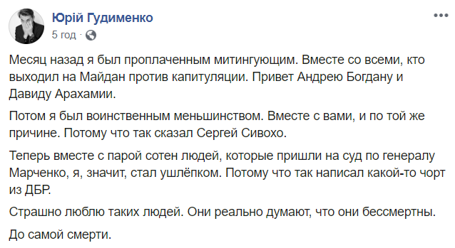 Слідчий пише співрозмовникові, що “ушльопков тут [в залі суду] п*****ць”, маючи на увазі людей, які прийшли підтримати Марченка.